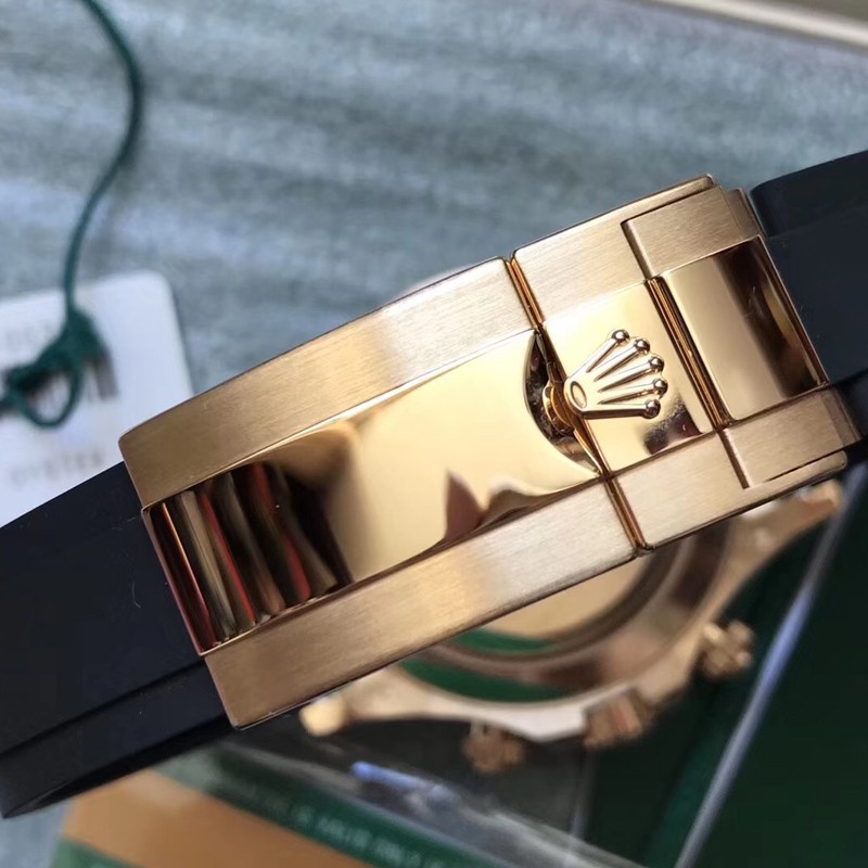 Die Chronographenfunktionen der Daytona werden durch Drücker aktiviert, die wie die Aufzugskrone verschraubt werden, wenn sie nicht verwendet werden, was eine Wasserdichtigkeit bis 100 Meter garantiert. Ein Tastendruck zum Starten, Stoppen oder Zurücksetzen des Chronographen erzeugt einen klaren, klaren Klick, der mit modernster Technologie perfektioniert wurde. Uhrmacher perfektionierten auch den Mechanismus, um dem idealen Fingerdruck auf die Drücker zu entsprechen, und konstruierten ihn, um einen sofortigen und genauen Start der Zeitmessung zu ermöglichen, ohne die Zuverlässigkeit zu beeinträchtigen.