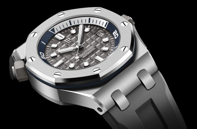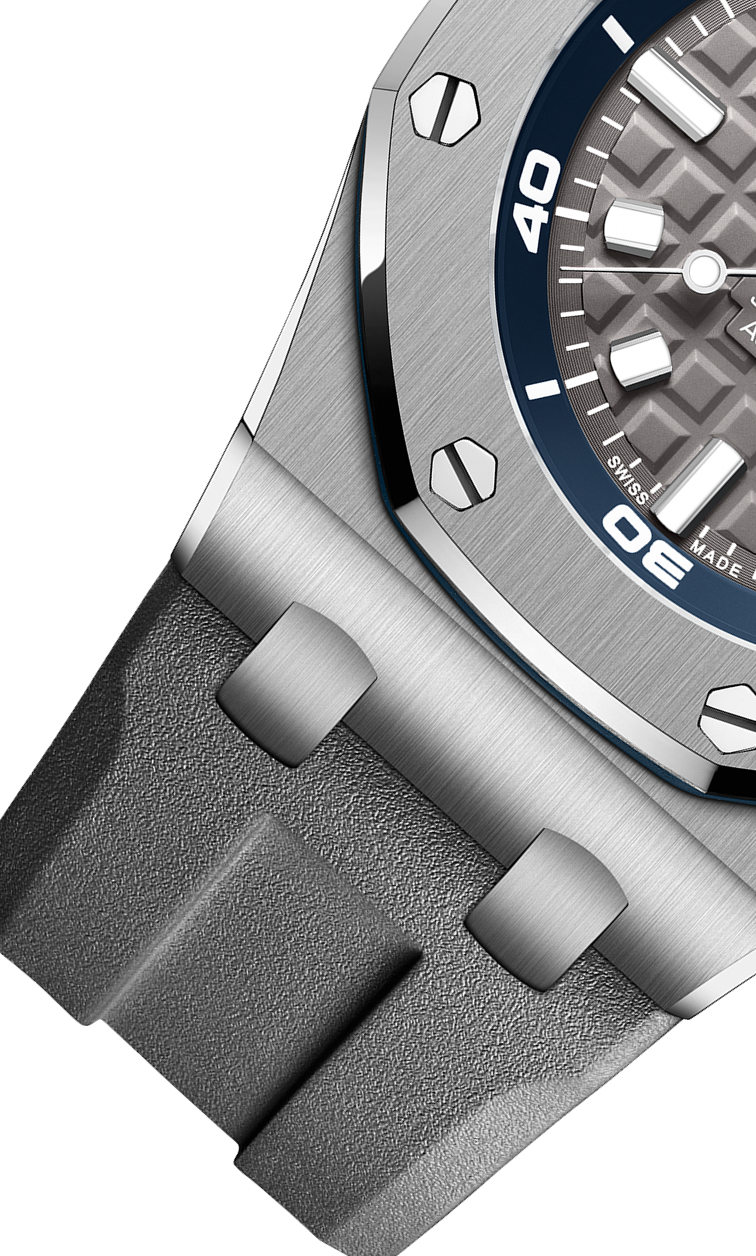 DIAL : Grey dial with “Méga Tapisserie” pattern, white gold applied hour-markers and Royal Oak hands with luminescent coating, blue rotating inner bezel with zone from 60 to 15 minutes in white