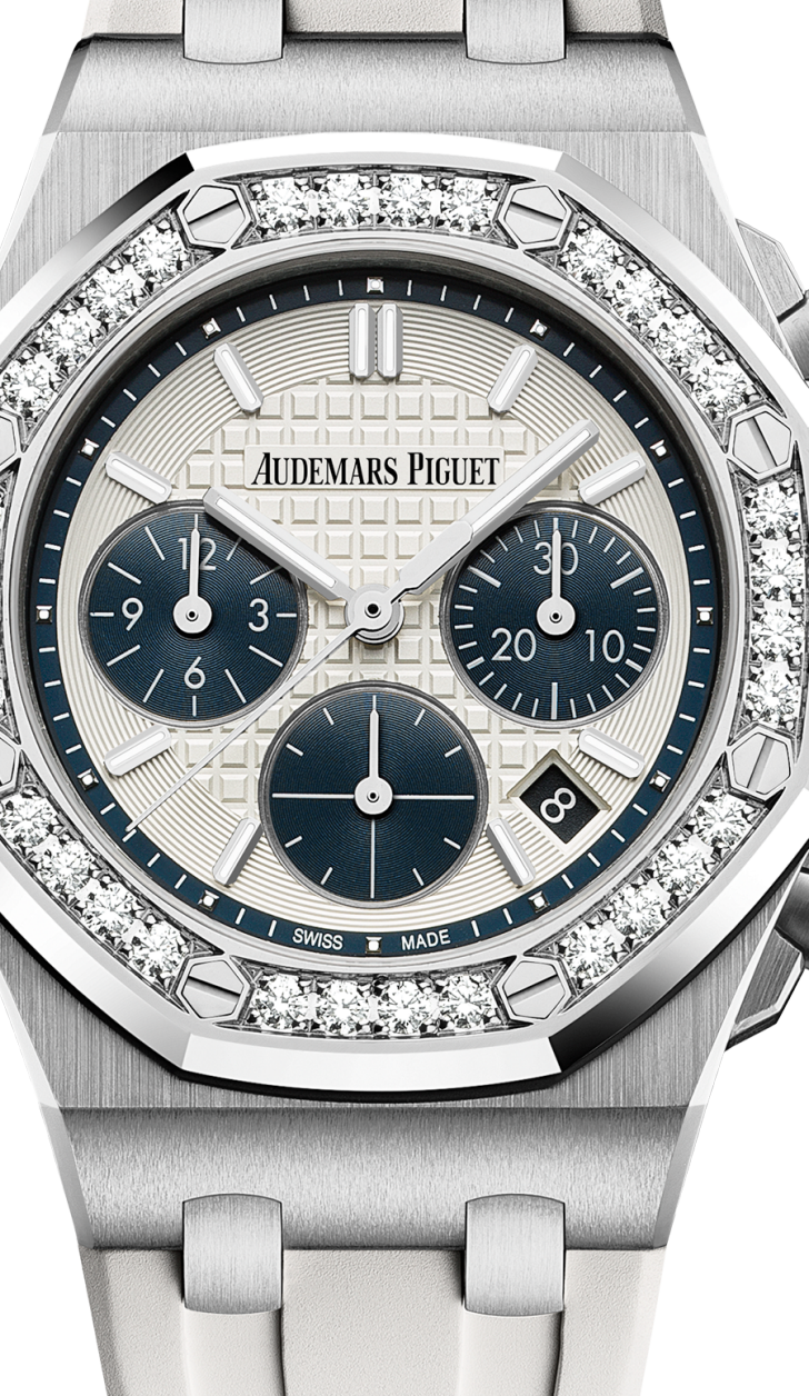 DIAL:Silver-toned dial with “Lady Tapisserie” pattern, blue counters, blue external zone, white gold applied hour-markers and Royal Oak hands with luminescent coating