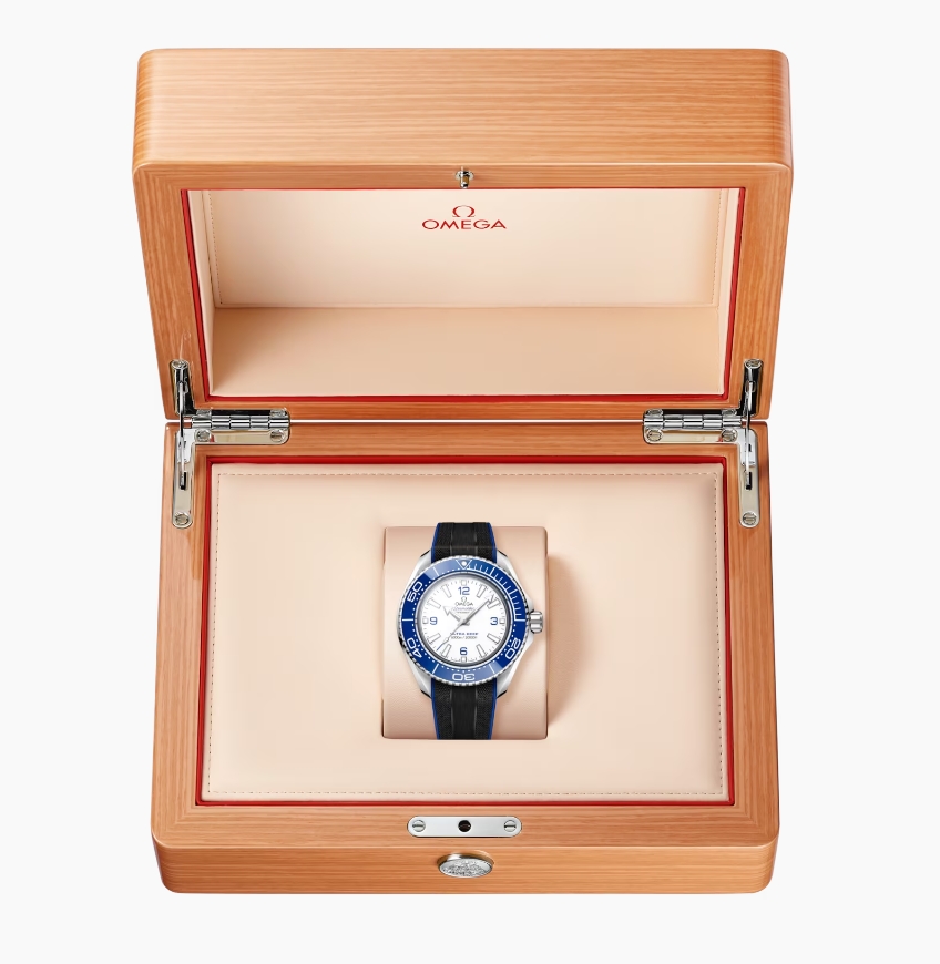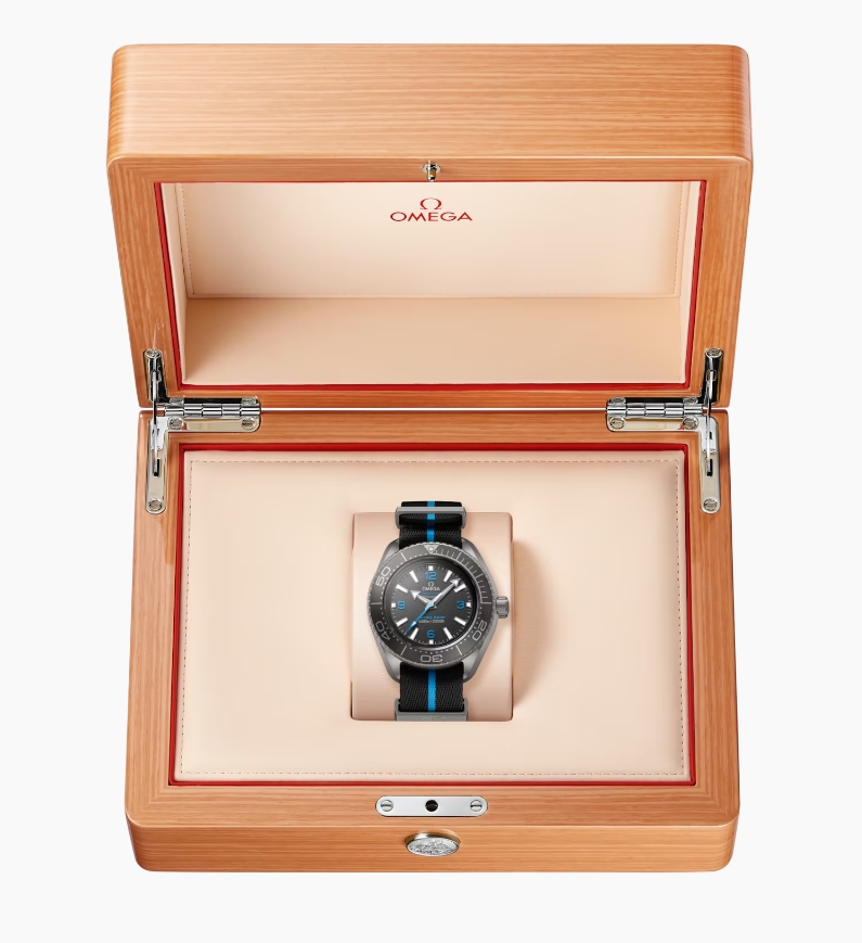 The watch includes distinctive “Manta Lugs” at each end of the case, which hold on to a striped black and cyan polyamide NATO strap with a loop and buckle in Grade 5 Titanium. On the caseback, there is a Grade 5 titanium medallion, laser-engraved with a Sonar emblem featuring the iconic OMEGA Seahorse at its centre. Inside, the watch is driven by the OMEGA Co-Axial Master Chronometer Calibre 8912.