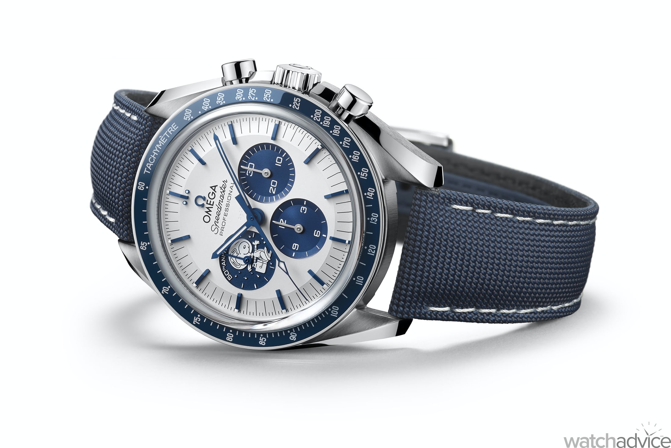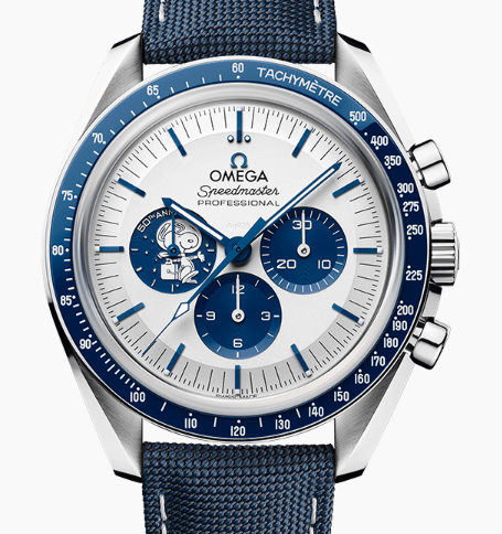 OMEGA Speedmaster Chronograph Anniversary "Snoopy Silver Award" (31032425002001) manual winding watch with a 42mm stainless steel case, blue ceramic bezel surrounding a silver dial and blue fabric strap with stainless steel buckle. Functions include hours, minutes, small seconds, chronograph, and tachymeter